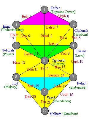 是對於構成世界基礎的十個“源質”(Sephira)與22個徑(Pass)的一個示意圖。“源質”這個詞沒有統一的精確譯法,不過一般畫圖的時候,我們都將它們畫成圓形,而“源質”也經常譯作“球體”。你也可以將它們理解為十種神格、境界或者說特質。這十個源質可以簡要總結如下: